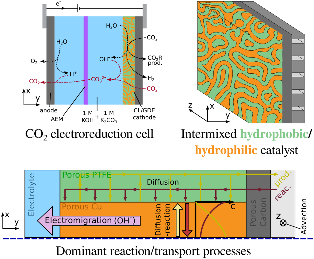 Development, 3D simulation, and validation of a predictive continuum model for multi-phase transport and reactions in CO/CO2 reduction electrocatalysts with intermixed hydrophobic and hydrophilic phases.