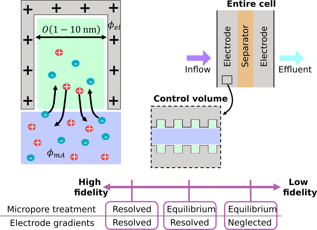 In a flow-through-electrode (FTE) CDI cell, electrolyte flows through a stack of porous electrodes with a hierarchical pore structure, wherein macropores are large enough to permit flow of electrolyte through the porous medium while micropores provide space for electrostatically-induced storage of ionic species when the electrodes are charged. The governing equations for transport at the micropore scale are well known, but simulations that resolve this scale would prove too expensive to capture ionic concentration and electric potential fields across the entire cell. The key to overcoming this dilemma, as described originally by Johnson and Newman [4], is recognition that the time scale of pore–scale dynamics is much faster than the time scale of device-scale transport. This analysis implies that micropores are in local quasi-steady equilibrium with their surroundings, allowing construction of a continuum model with effective control volumes that include numerous macropores and micropores in local equilibrium.