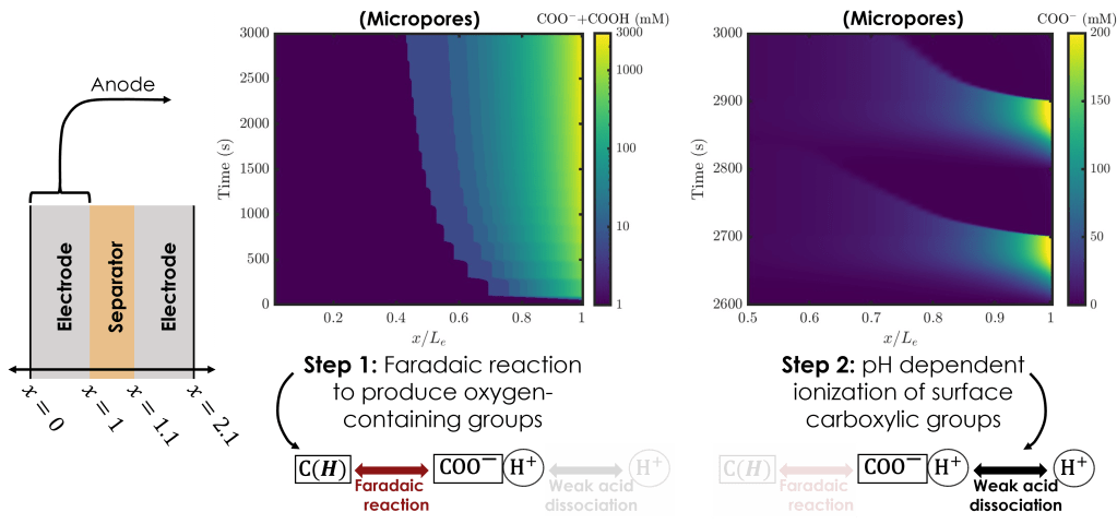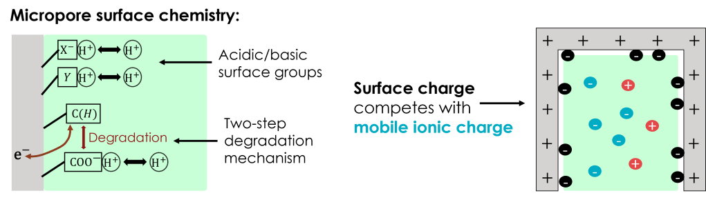 The presence of acidic and basic surface groups is expected to play a substantial role in the micropore dynamics. These groups may contribute to surface charge, depending on equilibration with the local pH via protonation/de-protonation reactions. For the case studied here, weakly acidic carboxylic groups are formed through electron-transferring degradation reactions. These carboxylic groups may de-protonate in sufficiently basic conditions, contributing to negative surface charge and competing against electrosorption of mobile anions.
