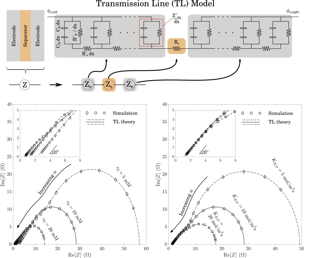 We verify consistency of the solver by comparing results against an analytical “transmission-line” model, which is valid in the limit of small voltage perturbations. Agreement is expected if the numerical solver has been implemented correctly and driving voltage perturbations are sufficiently small. As shown here, we find excellent agreement across the full range of bulk electrolyte concentrations and Faradaic reaction rate coefficients.