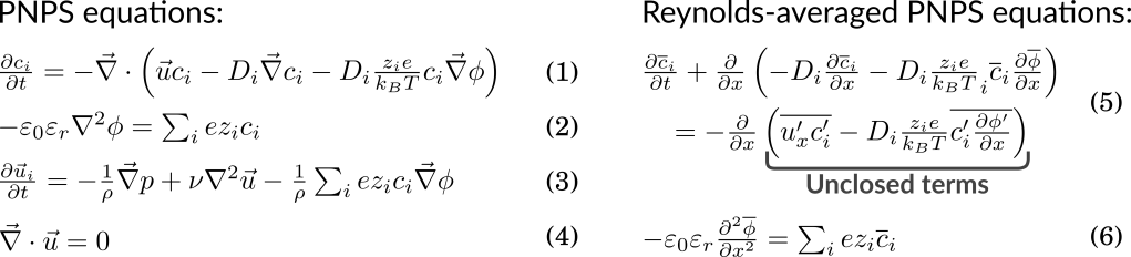 The leading-order closure model and measured eddy diffusivity may be incorporated into eq. (5), resulting in the well-known 1D Poisson-Nernst-Planck (PNP) equations, in which the effects of chaotic electroconvection are now represented wholly by the eddy diffusivity. We may now perform steady 1D simulations to directly solve for the mean concentration and potential profiles, substantially reducing cost compared to unsteady 3D simulations. Furthermore, we show via comparison against 3D salt transport simulations that the leading-order closure model is sufficient to yield excellent agreement.