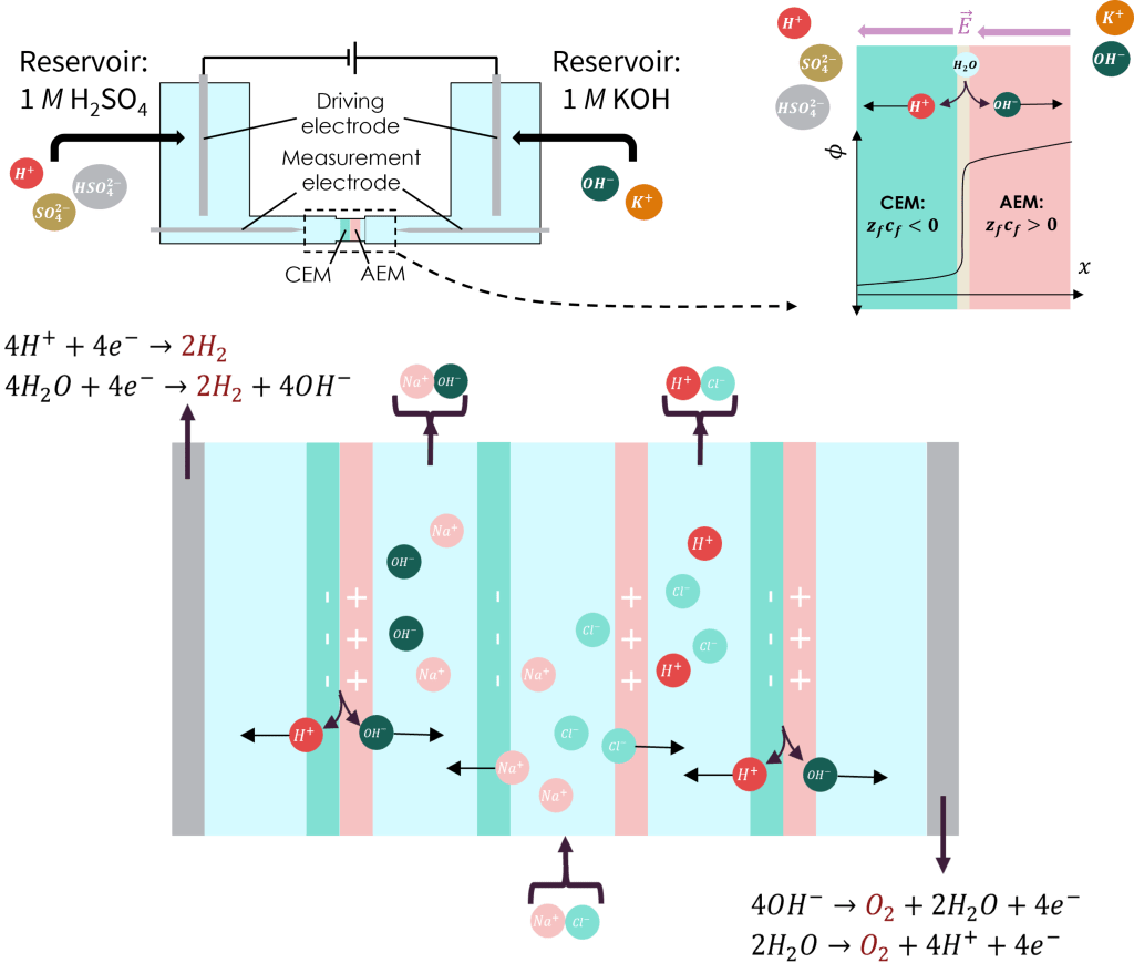 Electrochemical cells with varying applications and operating modes may be constructed by layering materials with different physical and chemical properties in specific arrangements. Consider, for example, bi-polar membranes, which are constructed by lamination of an anion- and cation-selective membrane. Thinking more broadly, an entire electrochemical cell (i.e., the cell shown above, which produces acids/bases from salts) may be represented in 1D as a multi-layered structure comprising anion/cation-selective membranes and electrodes separated by bulk diffusion layers.