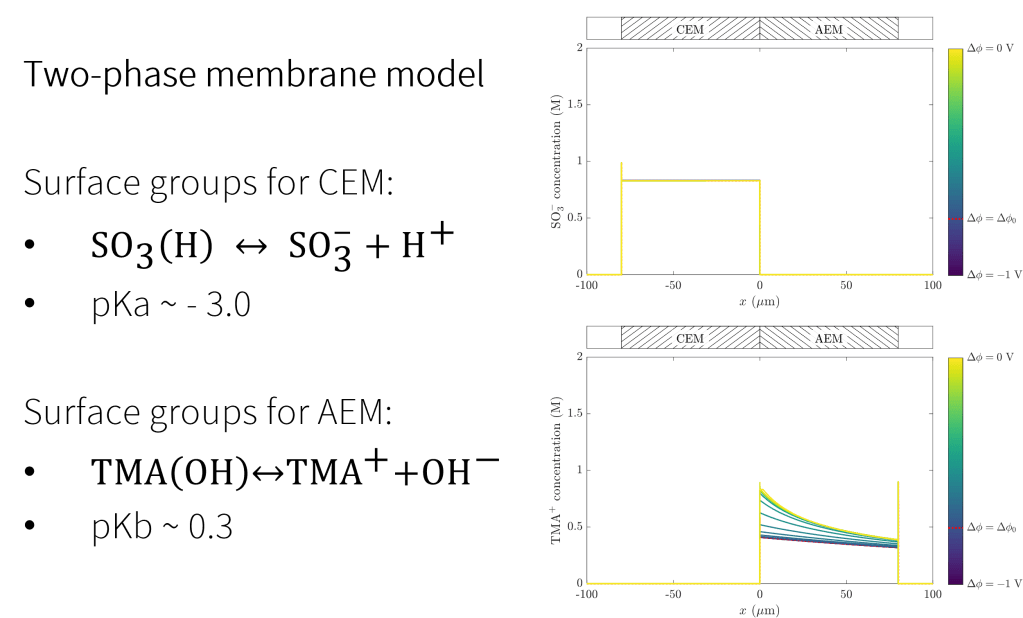Our simulation platform permits study of cases in which extreme variation of pH may require consideration of surface reactions involving ionic groups in the membranes. Shown above are concentration profiles across a bi-polar membrane for sulfonic groups and TMA+, functional groups commonly responsible for selectivity of cation- and anion-selective membranes, respectively. For the range of cell voltages shown here, the strongly-acidic sulfonic acid groups remain de-protonated, while the TMA(OH) groups encounter a pH swing large enough to alter the effective “background charge density.”
